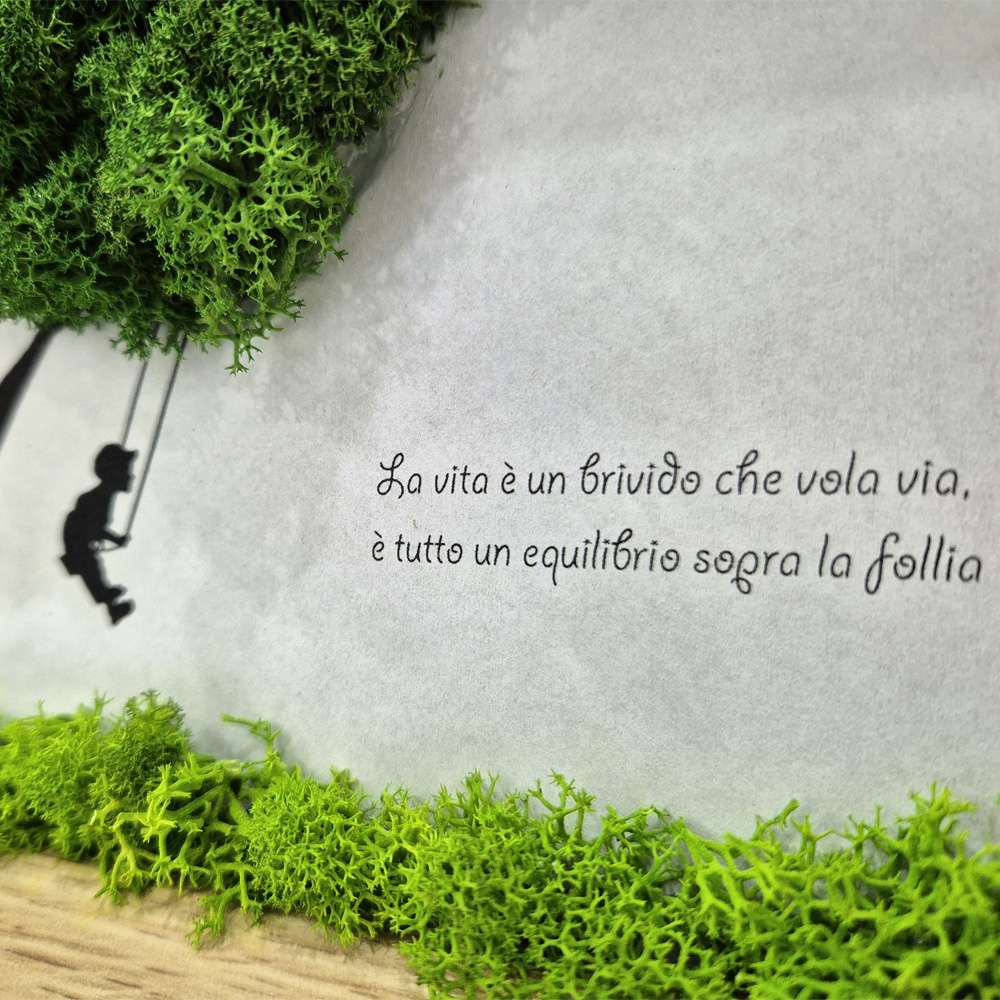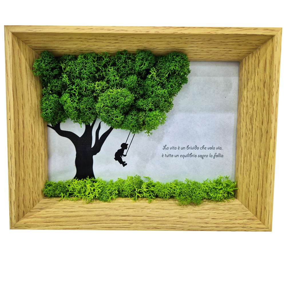 Esplora la nostra esclusiva bomboniera originale comunione con licheni stabilizzati: un delicato quadro che rappresenta un bambino sull’altalena. Questa creazione artigianale unisce, infatti, la tradizione dell’importante sacramento alla modernità del verde naturale. Grazie alla sua natura particolare, il quadretto dura nel tempo senza bisogno di cure. Certamente, rappresenta un pensiero significativo che ricorderà per sempre questo momento speciale nella vita di un bambino.