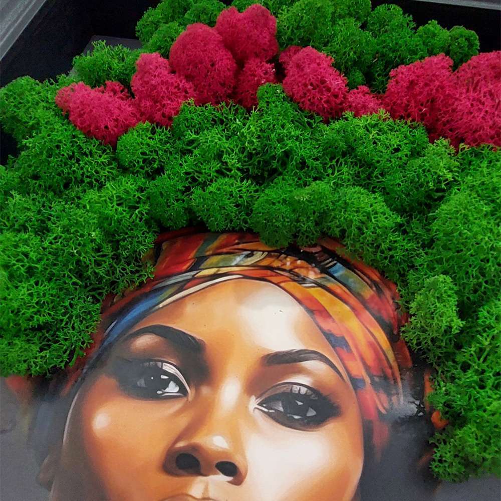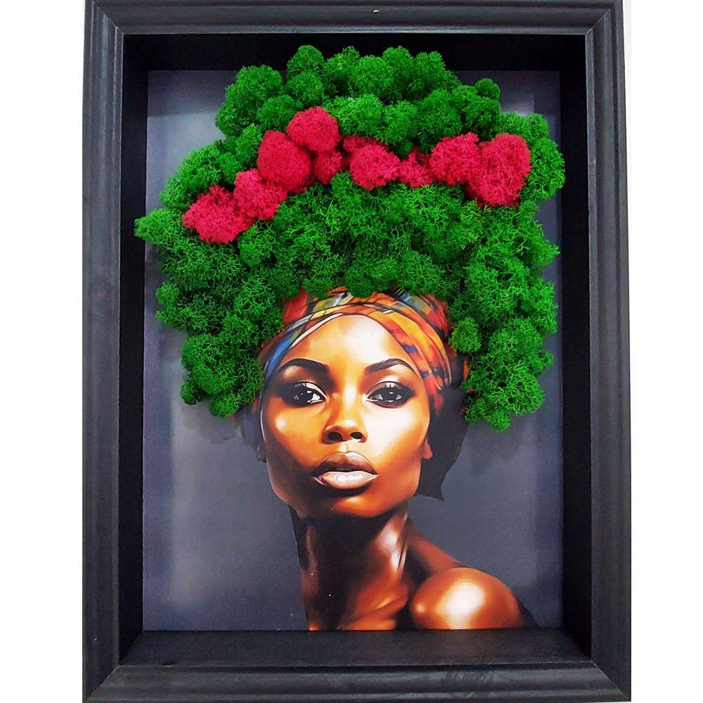 Il nostro quadro African Beauty in licheni stabilizzati rappresenta l’incontro perfetto tra arte contemporanea e natura. L’acconciatura, creata con rigogliosi licheni verdi stabilizzati, si arricchisce di vivaci tocchi di rosso che ricordano fiori tropicali. Il volto espressivo emerge con forza da uno sfondo scuro, creando un contrasto che esalta la tridimensionalità dell’opera e la sua presenza scenica.