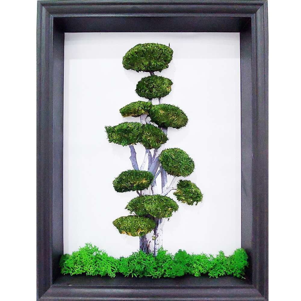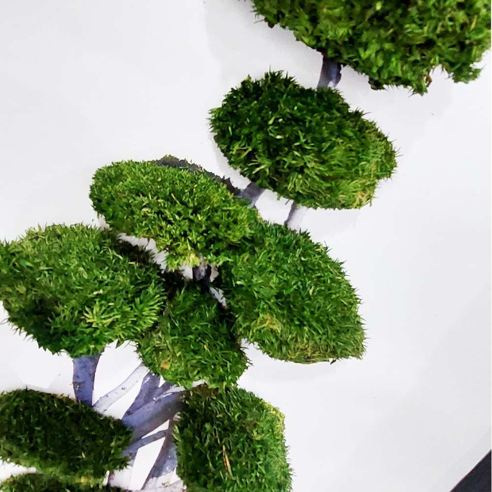 Questo quadro rappresenta un’innovativa applicazione del verde stabilizzato in interior design. L’effetto tridimensionale del bonsai giapponese, preservato grazie alle tecniche di stabilizzazione, crea un elemento decorativo che mantiene la bellezza della natura senza richiedere alcuna cura.