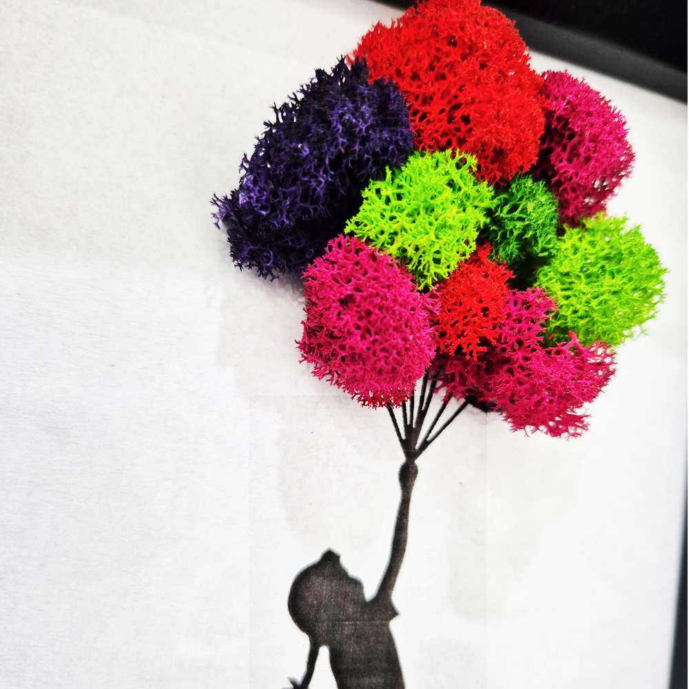 Scopri il nostro esclusivo quadro ispirato alla celebre Flying Girl with Balloons, realizzato con licheni stabilizzati. In questa reinterpretazione unica, la silhouette della bambina si libra verso l’alto, sospesa da palloncini creati in licheni colorati – un omaggio alla street art che si fonde con elementi naturali. La composizione cattura perfettamente il senso di libertà e leggerezza dell’opera originale, trasformandola in un pezzo d’arte eco-sostenibile che porta un tocco di magia in qualsiasi ambiente.